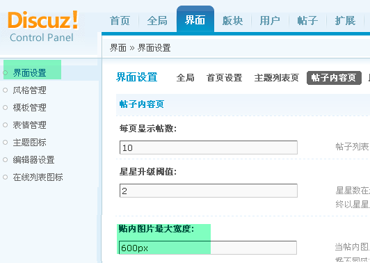 系統設置 => 介面 => 介面設置 => 帖子內容頁 => 帖內圖片最大寬度