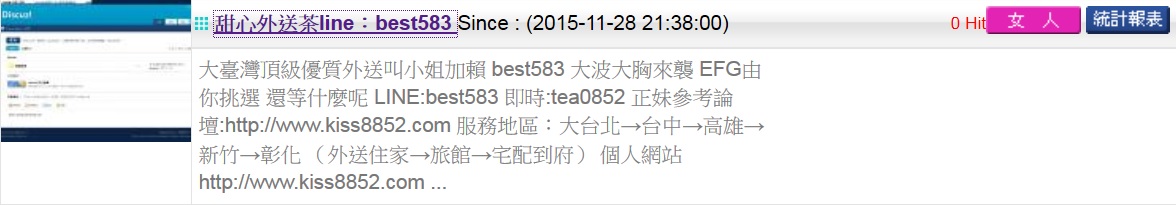 | 1.論壇名稱: 甜心外送茶line:best583 Since : (2015-11-28 21:38:00) |